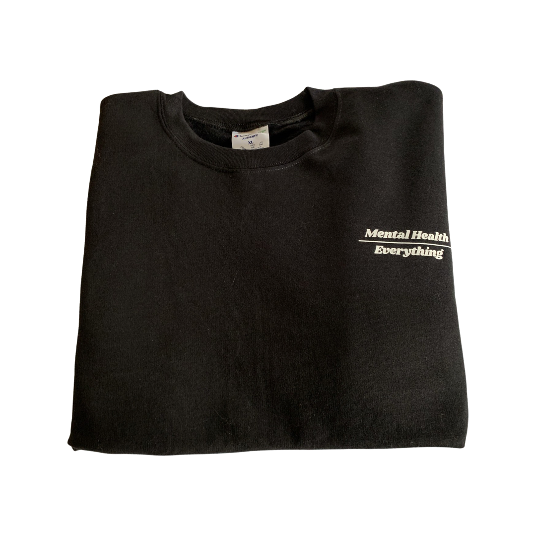 Poly-cotton blend black crewneck sweatshirt. Mental health over everything with gentle reminder to do the work on the inside of wrists